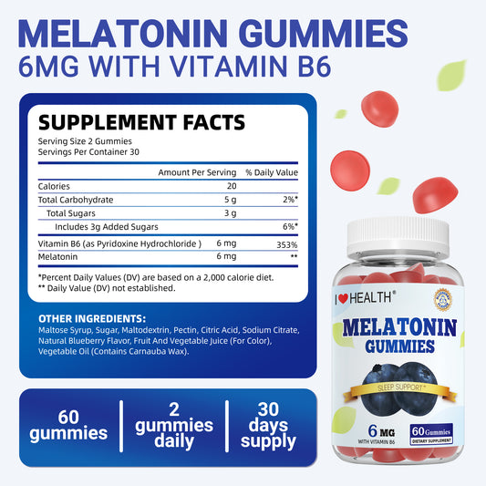 I Love Health Sleep Gummy | Melatonin 6mg + Vitamin B6 6mg Sleep Support Gummies with Natural Blueberry Flavor - Made in cGMP facility