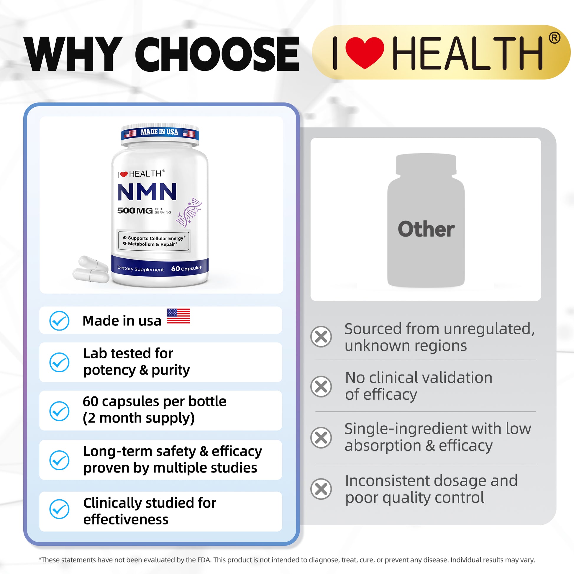 - 【Clinically Recommended 500mg NMN, 99.9% Pure NMN – Lab Verified】 Each capsule contains 500mg of high purity 99.9% Nicotinamide Mononucleotide (NMN) from FDA GRAS Standard Supplier, a direct precursor to NAD+ that supports cellular energy production and daily vitality.